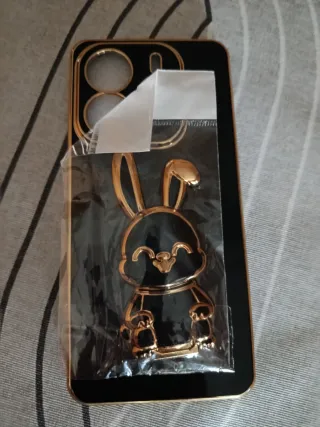 Funda protectora para Xiaomi Redmi Note 14 5G con un elegante diseño. incluye accesorio conejito para parte de atrás también negro y dorado sin abrir. - Color negro brillante. - Marco y detalles en dorado. - Protección para la cámara.