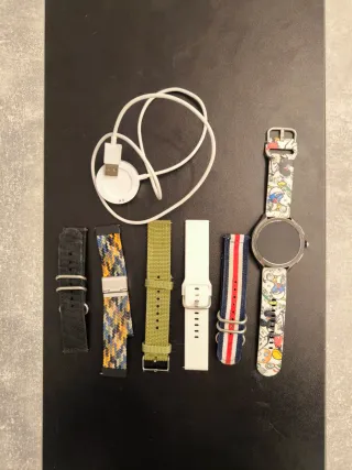 Reloj inteligente Xiaomi Watch 2 Pro con varios accesorios. - Incluye cargador. - Correa negra. - Correa con diseño geométrico. - Correa verde. - Correa blanca. - Correa a rayas (azul, blanco, rojo). - Correa con estampado de personajes.