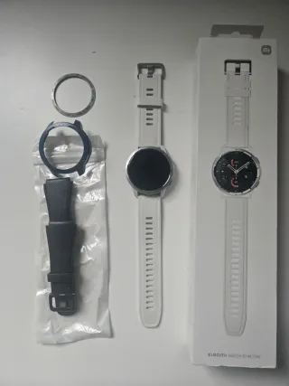 Reloj inteligente Xiaomi Watch S1 Active. - Bisel plateado. - Correa negra adicional. - Funda protectora azul.