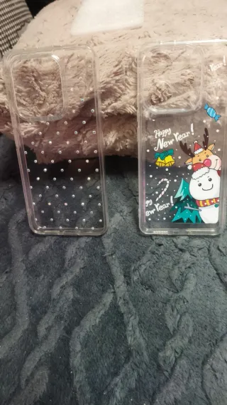 Dos fundas transparentes para móvil Xiaomi 14 Note con temática navideña. - Una funda decorada con un muñeco de nieve, reno y árbol de Navidad. - Otra funda con pequeños detalles brillantes. - Diseño festivo y divertido.