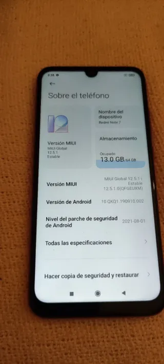 Teléfono móvil Xiaomi Redmi Note 7 con 64 GB de almacenamiento. - Modelo: Redmi Note 7 - Capacidad: 64 GB - Versión MIUI: 12.5.1 Estable Color Nebular Red Caja, manual,cargador y funda original.