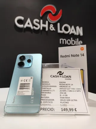 Teléfono móvil Xiaomi Redmi Note 14 en color negro y con 256GB de almacenamiento. - Pantalla AMOLED de 6,67 FHD+ con 120Hz. - Cámara delantera de 20 MPX y cámaras traseras de 108+2+2 MPX. - Batería de 5500 mAh. - Procesador Helio G99 Ultra. - 8+4 GB de RAM. - Garantía de 1 año. CASH LOAN MOBILE Tienda de telefonía nueva, segunda mano y reacondicionada de confianza en Avda. Constitución 53, Torrejón de Ardoz, Madrid.