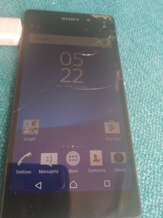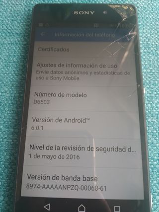 Teléfono móvil Sony Xperia con la pantalla rota. - Modelo Xperia. - Marca Sony. Desconozco el modelo exacto ni la capacidad de almacenamiento ya que no se ve nada en la pantalla, pero parece ser un Z2 o Z3. El móvil enciende y también abre la cámara cuando se pulsa el botón. Haría falta formatearlo. Envío disponible