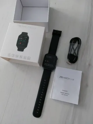 Smartwatch ZTE en color negro, listo para usar. Incluye su cargador. - Diseño moderno y elegante. - Correa ajustable. - Base de carga circular.