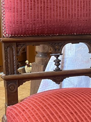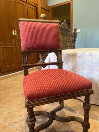 Conjunto de sillas con un diseño clásico y elegante. - Estructura de madera robusta. - Tapicería de tela en color rojo. - Detalles ornamentales en la madera.
