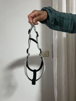 Arnés para perro de talla S. Diseñado con materiales resistentes y un acabado plateado. - Cierre de hebilla. - Ajustable para mayor comodidad. Compra en un punto de encuentro y precio negociable.