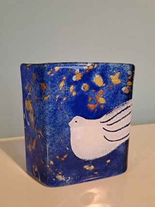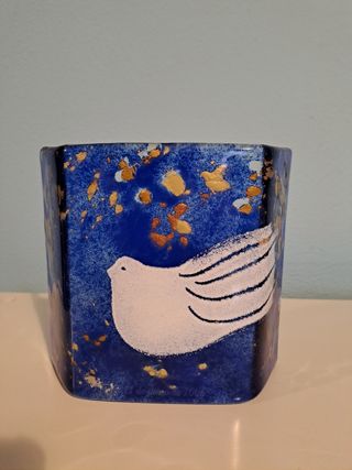 Pieza de vidrio termofusionado con decoración paloma de la Paz. Técnica fusing. Dimensiones: Alto :15, Largo: 15, Fondo: 5 cm. Artesanía cristal. Figura