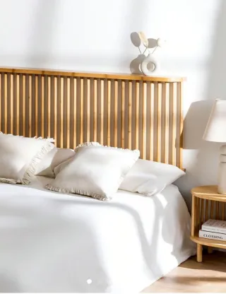 Cabecero de cama con un diseño natural y moderno. - Fabricado en bambú y madera. - Tonos beige y marrón que aportan calidez, tiene un mes