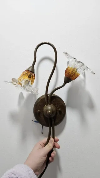 Preciosa pieza de época. Un espejo de madera con dos apliques de luz. Ideal para darle un toque vintage a tu hogar. - Espejo rectangular con marco de madera. - Dos apliques de luz con tulipas de cristal opalino. - Perfecto estado de conservación.