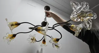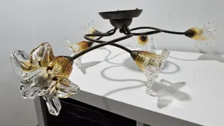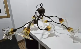 Lámpara de techo con un diseño floral - Base y brazos de forja en tono marrón. - Seis tulipas de cristal transparente con detalles ámbar.