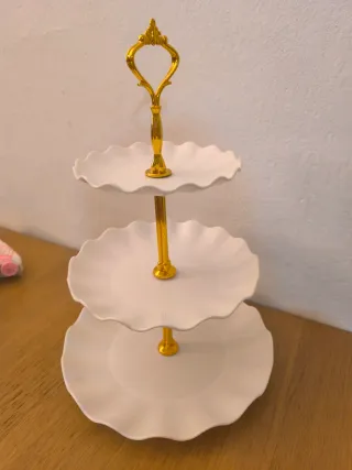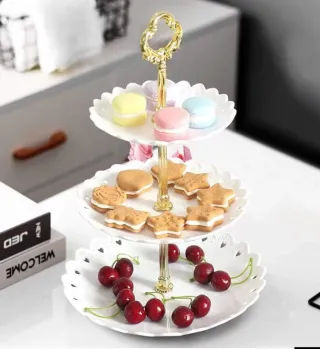 Elegante soporte de plástico para presentar postres y aperitivos. Ideal para celebraciones. - Diseño de tres niveles. - Acabado blanco con detalles dorados. Tengo dos unidades, el precio corresponde a uno