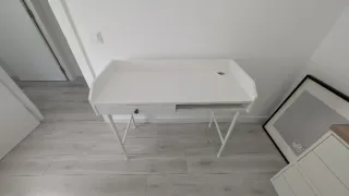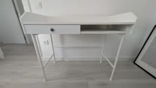 Escritorio moderno de Ikea, modelo HAUGA. Su diseño minimalista se adapta a cualquier espacio. - Tablero espacioso con orificio para cables. - Cajón integrado para almacenamiento. - Patas metálicas.