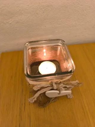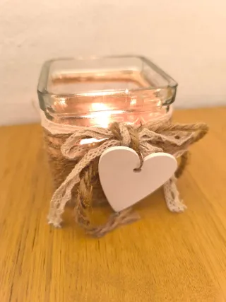 Este portavelas de cristal es un bonito detalle para tu hogar o como regalo. - Diseño con cuerda de yute y encaje. - Incluye un adorno en forma de corazón blanco.