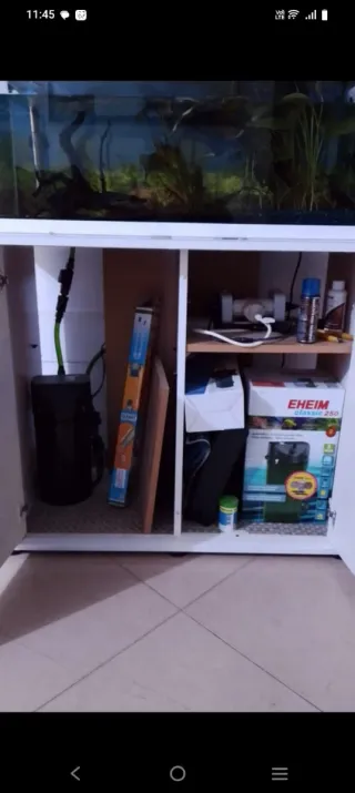 Acuario de 100 litros listo para usar. - Filtro Eheim Classic 250 + accesorios. - Calentador. - Red. - Termómetro. - Limpiador de cristales. - Esponja de limpieza. -Pantalla de 1m. -Accesorios: pinzas, tijeras poda, esponjas, otro filtro de mochila, parideras....