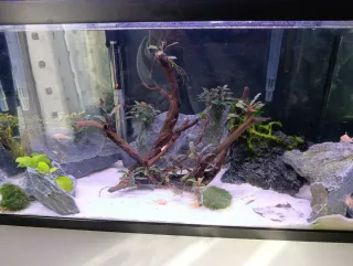 Acuario de 55 litros con todo lo necesario para empezar. - Incluye dos filtros. X2 aquaclear 20 - Incluye calentador.Sunsun 100w - Incluye pantalla LED. Hygger RGB auto - Decoración con rocas y troncos. - Sustrato de arena blanca.sansibar White