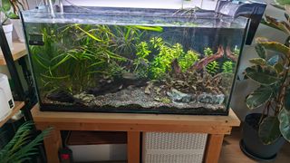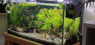 Acuario de 200 litros completo: - Urna cristal de 100x40x50. - Mueble hecho a mano - Filtro exterior Oase Filtrosmart Thermo 300 - Filtro de mochila 1200L/h - Iluminación Twinstar C900 III + Dimmer WiFi - Ventilador Boyu FS-606 - Termostato Inkbird ITC-308S - Kit Co2 3.5L (botella, manoreductor, cuentaburbujas y difusor) - Pipetas metálicas Actualmente está montado, pero en proceso de desmontaje. Los peces que se aprecian en las fotos NO están incluidos en la venta. Además incluyo todos los accesorios para limpieza, repuestos y demás utensilios, mejor preguntar. Lo vendo por falta de tiempo para cuidarlo como merece.