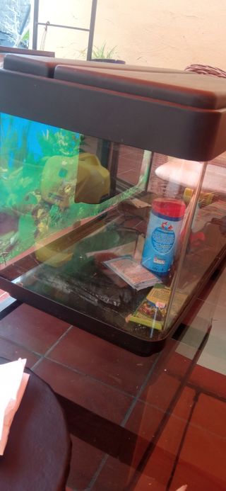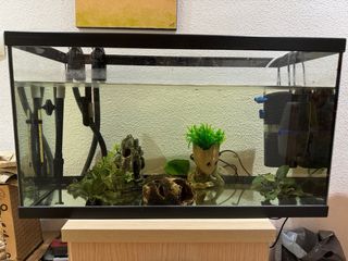 LIQUIDACIÓN!!! Acuario grande: fotos 1 y 2 - Medidas: 81cm de ancho, 31cm de fondo y 47cm de alto. 110 litros. - Incluye todo lo que sale en la segunda foto. Depuradora/filtro, comedero automático, limpia fondos eléctrico y calentador. - Precio: 75€ Acuario pequeño: fotos 9y10 - Medidas: 30cm de ancho, 15cm de fondo y 31cm de alto. - Incluye todo lo que sale en las fotos 9y10. Depuradora, paridera y adornos. - Precio: 30€ Las tres piedras: foto 3 (sin coliseum) - Precio: 15€ El coliseum: foto 4 - Medidas: 56cm de ancho, 12 cm de fondo y 30cm de alto - Precio: 20€ El Acuario grande necesita limpieza.