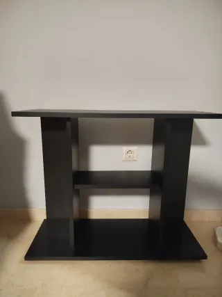 Mueble de soporte para acuarios con un diseño moderno. - Estructura de madera resistente. - Dos niveles de almacenamiento. - Color negro elegante. - Soportable acuarios de 100L ( el que tenía )