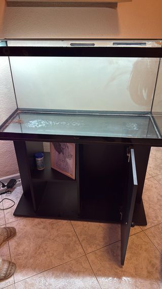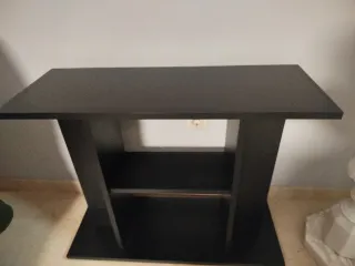 Mueble para acuario en color negro, medidas aprox. 100 cm largo x 40 cm ancho x 80 cm alto. Diseñado específicamente para acuarios de 200L o 240L, con compartimentos y agujeros ya preparados para colocar un sump y pasar cables y tubos. Está bastante usado y tiene marcas, roces y desgaste visibles (ver fotos), pero es totalmente funcional y resistente. Ideal para montar un acuario económico o proyecto. Solo recogida en mano.