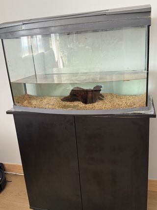 Acuario de aproximadamente 90 o 100 litros, con su mueble y filtro. - Mueble de madera con puertas. - Filtro externo Eheim ecco pro 300 mas uno interior (para mover el agua) Eheim también. Regalo pequeño gambario, ambas urnas tienen sistema de filtrado, calentador nuevo y una bomba de oxigeno, ademas de piedras volcanicas y dragon. El filtro externo tiene 4 meses de uso y me costó mas de 160€ Regalo el mueble y una bolsa de piedra fina para decoración. Tengo otro acuario prácticamente nuevo, si quieres los dos mas el gambario lo dejariamos en 300, el afiario nuevo tiene inquilinos como escalares, barbos, coridoras y alguno mas.