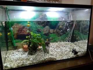 Acuario de 100 litros en buenas condiciones. Ideal para principiantes. - Medidas aproximadas: 80x30x40 cm (largo x ancho x alto) - Incluye filtro y luces LED integradas. - Fondo decorado con grava blanca.