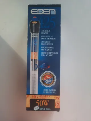 Calentador para acuario de la marca Eden, modelo 425. - Potencia de 50W. - Apto para acuarios de hasta 50 litros. - Fabricado en Italia.
