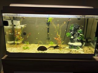 Vendo acuario totalmente montado y en funcionamiento. Ideal para iniciarse en la acuariofilia o para ampliar tu colección. incluye 🌿 Plantas naturales enraizadas 💡 Iluminación superior 🔁 Filtro interior y filtro de esponja doble con canutillos 🌡️ Calentador con termómetro de tira y termometro digital. ⚙️ Todo funcionando perfectamente 🪵 Sustrato de arena y grava, decoración incluida. 📏 Tamaño 90 L ✅ Solo necesitas enchufarlo y listo. Actualmente con guppys, japonicas