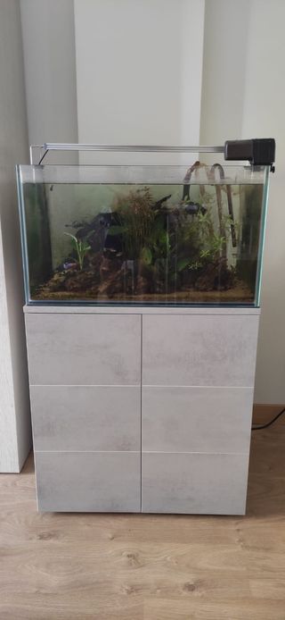 Acuario Aqua Light de 100 litros. Ideal para crear tu propio ecosistema. - Diseño moderno y elegante. - Incluye accesorios para su puesta en marcha: Raíces, rocas y plantas de plástico para decoración del acuario. 300ml de denitrol: acondicionador de agua para acuario. 200ml de ferropol: fertilizante de plantas. 5 litros de biotopol. 5 litros de sera toxivec 1 paridera con caja 1 comedero eléctrico 24/12 horas 3 filtros 1 bomba de aire ajustable marca EHEIM. 1 calentador. Si estás interesado se puede negociar, el fluorescente falla por eso es algo negociable.