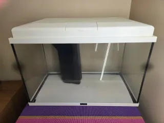 Acuario de cristal y plástico, con un diseño moderno y funcional. - Tapa blanca con apertura. - Filtro interior incluido. - Tubos de soporte para la tapa.