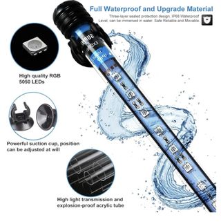 Luz LED para acuario con diseño de alta calidad y material de actualización. Artículo totalmente nuevo a estrenar como otros productos que tengo puestos en mi perfil. Es posible que el embalaje esté algo roto, pero el producto está sin usar y nuevo. Puedes ver más artículos en mi perfil. - LEDs RGB 5050 de alta calidad. - Diseño de sellado de tres capas, nivel de impermeabilidad IP68. - Tubo acrílico de alta transmisión de luz y a prueba de explosiones. - Potente ventosa, posición ajustable.