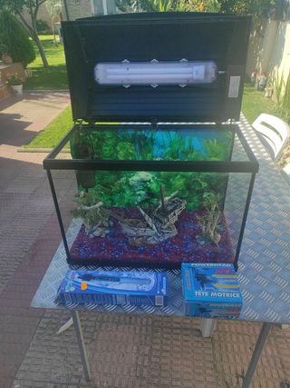 Acuario completo de 110 litros. Filtro externo eheim 2213 de 440 l/h con tubuladuras, flauta, bastón de subida y bajada, llaves dobles. Calentador. Grava y arena de sílice. Y alguna cosa más tanto para mantenimiento como adornos. El acuario tiene tapa con luz, pero hay que cambiar los tubos fluorescentes que tiene 2. Se entrega acuario y filtro totalmente limpios. NO ES NEGOCIABLE, en caso de envío, se intentará proteger al maximo, pero no soy responsable del estado en el que llegue.