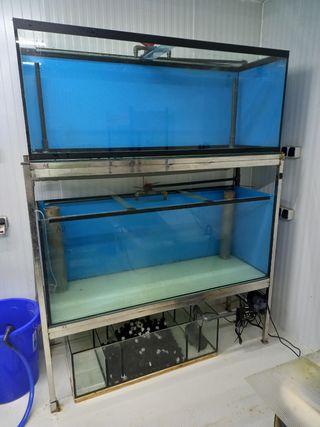 bateria acuarios 2 acuarios de 450 litros (150 largo x 50 ancho x 60 alto) con sump filtro biologico (material filtrante) bomba de recirculacion filtro ultravioleta Uv 2 calentadores eheim de 300 w estantería acero inoxidable Negociable peces disco recoger Se hace despiece.