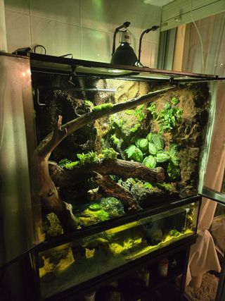 Se vende terrario grande de exoterra de 90x45x90. Viene con lo que se ve en las imágenes, dos domos de exoterra con sus respectivas bombillas de noche y de día también de exoterra y termómetro y sujeta domos de exoterra, también el mueble especial para terrario de esta medida, incluye sistema de riego automático y el material de decoración. El terrario se puede tener como en las primeras fotos con la zona de abajo modo acuario y dejarlo acuaterrario o como esta ahora que es más pensado para terrario normal, medio paludario. Cualquier duda se puede preguntar sin compromiso.