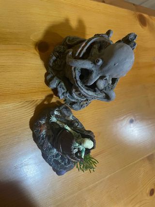 Piezas de piedra natural, ideales para decorar acuarios o terrarios. Su textura y color aporta la asociación de calor en reptiles. - Textura rugosa y estratificada. - Tonos oscuros y grises. Precio según piedra . La primera 12 La segunda 34 Las demás pequeñas las tres 6 € Solo envíos y no por correos.