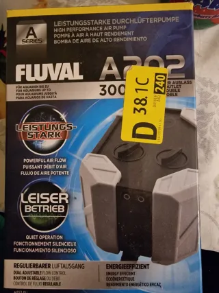 Bomba de aire Fluval A202 de alto rendimiento para acuarios. - Potente flujo de aire. - Funcionamiento silencioso. - Doble salida de aire. - Control de flujo dual ajustable. - Eficiencia energética.poco uso 2-3 meses