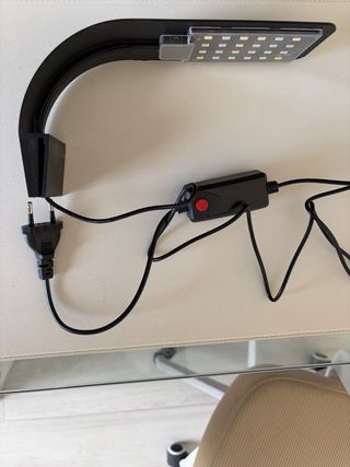 luz para acuario, 6W con pinza/soporte para cristal con bisagra, mide 22cm, ver características en las fotos. Aunque tiene muy poco uso, tiene salpicaduras de agua del filtro y uno de los tornillos de plástico (se ve en la foto) no se donde estará, pero no sé mueve con uno. Tiene boton para encender y apagar. NO NEGOCIABLE, VENTA EN MANO O ENVIO SOLO POR WALLAPOP.