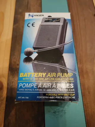 Bomba de aire a pilas Hagen para acuario. Incluye línea de aire y piedra. - Bomba de aire a pilas. - Incluye línea de aire de 18 (450 mm). - Incluye piedra de aire. - Portátil con clip de sujeción.