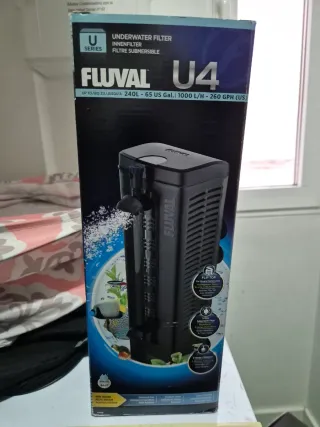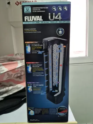 Filtro de acuario Fluval U4, modelo U4. - Sistema de filtración en tres etapas. - Para acuarios de hasta 240L. - Caudal de 1000 L/H. Completamente nuevo, vendo por cambio de urna y venir equipado con el, yo tengo uno externo y no lo utilizaré
