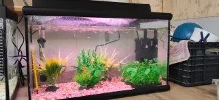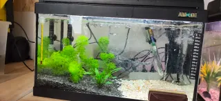 Se ceden dos acuarios completos, listos para usar. Incluyen plantas naturales y accesorios. - Dos acuarios de diferentes tamaños. - Plantas acuáticas verdes. - Termómetro. - Calentador. - Filtro. Unos 50 gupyys alevines y adultos
