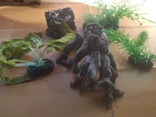 Conjunto de figuras decorativas para acuarios, con un diseño que imita elementos naturales como rocas y raíces. - Figuras de plástico y piedra. - Incluye plantas artificiales.