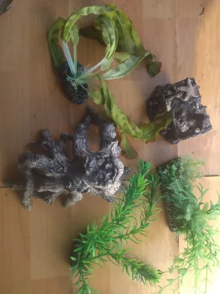 *4 plantas decorativas de acuario, 2 de plástico y 2 de tela, usadas pero en buen estado. *La planta naranja, la parte más alta estirada 20cm *La planta roja 10cm *La planta verde 12cm *La más pequeña 5cm Todas por 8 euros