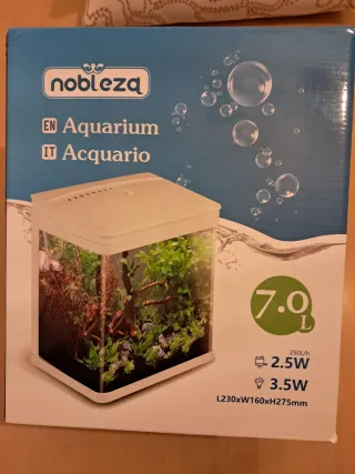 Acuario listo para disfrutar con todo lo necesario. - Decoración con rocas y plantas. - Filtro y bomba de aire. - Incluye caja.