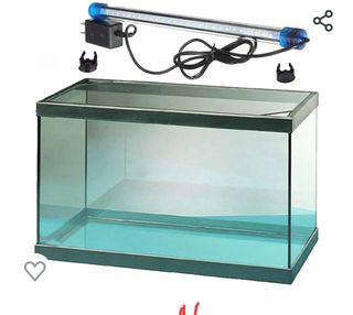 Pecera de 90 litros, ideal para acuarios o terrarios. Tiene algunas ralladuras pero al rellenarla de agua no se aprecia. - Tapa de malla negra de plástico. (No es su tapa original) - Base gris. -Oxigenador con dos bocas para dar salida a los tubos. -Filtro eléctrico. -Figuras decorativas. -Dos cajas de piedras -Dos cajas de piedras pequeñas para la base del acuario. -Tira de led.