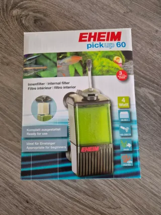 Vendo filtro interior EHEIM Pickup 60 para acuario para depósitos de hasta 60 L. Incluyo en el pack: • Filtro interior EHEIM Pickup 60. • Calentador de agua para acuario. • Medidor de temperatura. Características del filtro: - Potencia: 4 Watt. - Capacidad: 30-60 litros. - Caudal: 150-300 l/h. - Apto para agua dulce y marina. - Ideal para principiantes.