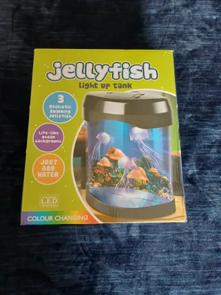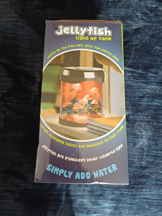 Acuario decorativo con medusas que se mueven y cambian de color. Crea un ambiente relajante y visualmente atractivo. - Incluye 2 medusas realistas. - Fondo de océano. - Luces LED de cambio de color. - Fácil de usar: solo añade agua.