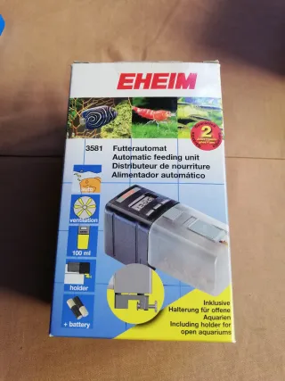 Alimentador automático EHEIM 3581 para acuarios. Permite programar la dispensación de comida para peces. - Capacidad de 100 ml. - Incluye soporte para acuarios abiertos. - Funciona con pilas (no incluidas). - Diseño compacto y fácil de instalar.