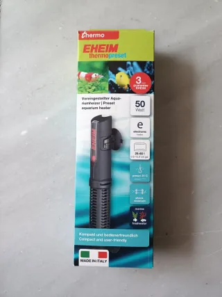 Calentador de acuario EHEIM thermopreset de 50W. Ideal para acuarios de 25-60 litros. 2 años de garantía. Precio no negociable. Posibilidad de incluir tortuguera por 15€ más. - Preajustado a 25°C. - Electrónico. - Resistente a golpes. - Apto para agua marina y dulce. - Compacto y fácil de usar. - Fabricado en Italia.