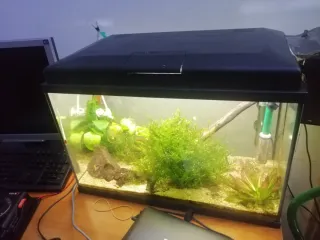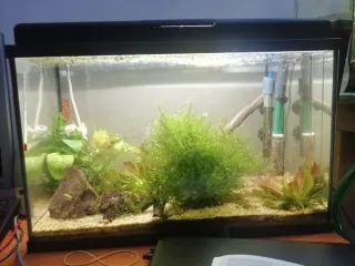 Acuario de 60cm en buen estado.30 litros - Incluye filtro y calentador. - Perfecto para peces pequeños. - Tapa con cierre de seguridad