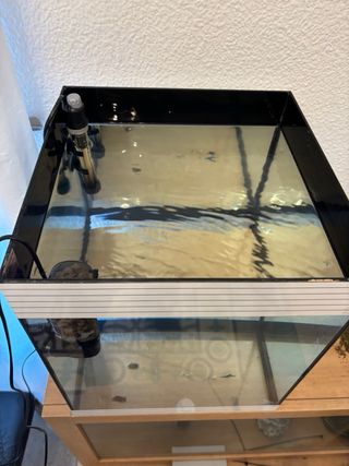 Acuario de 50L con tapadera. Está en muy buenas condiciones, lo blanco no es arañazo, es cal del agua. Se puede limpiar.