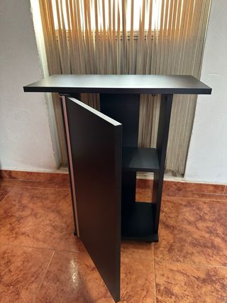 Mueble auxiliar en color negro y detalles plateados, ideal para acuario, costurero o televisor. Está en muy buen estado. - Perfecto para colocar una pecera. - Diseño compacto y elegante. - Un estante interior para almacenamiento.